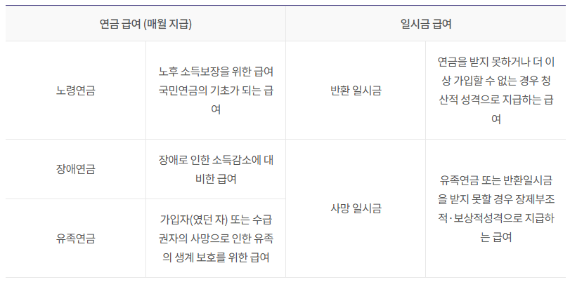 국민연금은 나이가 들거나 장애 또는 사망으로 인해 소득이 감소할 경우 일정한 급여를 지급하여 소득을 보장하는 사회보험으로서 국민연금 급여종류에는 노령연금, 장애연금, 유족연금, 반환일시금, 사망일시금이 있습니다.