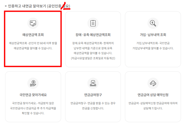 [국민연금공단 홈페이지]로 들어가 [자주 찾는 서비스_내 연금 알아보기]로 들어가면 인증없이 간단하게 [예상연금 알아보기]와 인증하고 [내연금 알아보기]서비스가 있습니다. 공동인증서 또는 간편 인증을 통해 [내연금 알아보기]서비스를 이용하면 보다 정확한 국민연금 수령액을 조회할 수 있습니다.