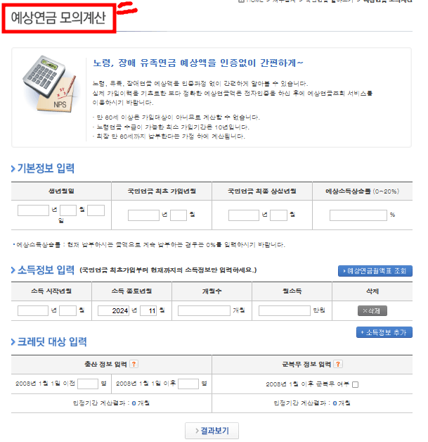 국민연금 수령액을 간단하게 계산하기 위해서 국민연금공단 홈페이지 [예상연금 모의계산]서비스에서 생년월일, 가입기간, 월 납입 보험료 등을 입력하면 간단 계산기를 사용하여 국민연금 수령액을 쉽게 계산할 수 있습니다.